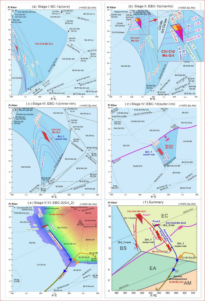 针对以上科学问题,bat365在线中国登录入口地球科学与工程学院李旺超博士研究生,在其博士导师尹常青教授的指导下,与中国地质科学院张泽明研究员、澳大利亚莫纳什大学Peter A. Cawood教授、上海交通大学李顺副教授、中国地质大学(北京)丁慧霞副教授、以及bat365在线中国登录入口前寒武课题组张健教授、钱加慧副教授和张艳灵博士合作,在青藏高原东构造结雅鲁藏布江缝合带东段米林地区(图1)的构造混杂岩中率先识别出了低温榴辉岩相变质岩,并对其开展了详细的岩石学、矿物化学(图2)、热力学变质温压计算和视剖面相平衡模拟(图3)、以及原位独居石年代学研究。结果显示这些高压低温变质岩经历了一个复杂的“yo-yo型”P-T路径,即两次低温榴辉岩相变质作用和两次快速折返过程,晚期的折返和冷却过程大约发生2500-2200万年前。该研究表明俯冲隧道中的大规模物质对流循环是这些低温榴辉岩经历多旋回变质作用最可能的形成原因,也是其最可能的折返机制(图4)。