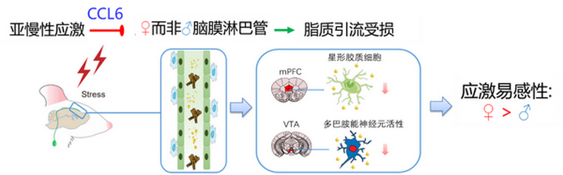 脑膜淋巴管是最近在中枢神经系统中被鉴定的免疫结构,具有清除脑源性分子和运输免疫细胞的重要功能,是连接中枢神经系统和外周免疫系统的桥梁。近日,bat365在线中国登录入口中山医学院叶小菁团队、孙逸仙纪念医院林伟杰团队和中南大学湘雅二院张燕团队合作在Nature Communications期刊发表题为“A functional role of meningeal lymphatics in sex difference of stress susceptibility in mice”的研究论文。该论文报导了亚慢性可变应激(sub-chronic variable stress,SCVS)诱导雌鼠而非雄鼠出现抑郁样和焦虑样行为,并伴随着雌鼠而非雄鼠脑膜淋巴管结构和功能发生损伤,而调控脑膜淋巴管可改变雌雄小鼠对应激诱发的抑郁样和焦虑样症状的易感性。研究人员进一步发现,应激诱导脑膜淋巴管内皮细胞表达趋化因子CCL6损伤其自身,进而导致甘油三酯等脂质分子在情绪关键脑区前额叶皮层(mPFC)和腹侧被盖区(VTA)累积,引发mPFC星形胶质细胞数量和VTA多巴胺神经元活性异常。