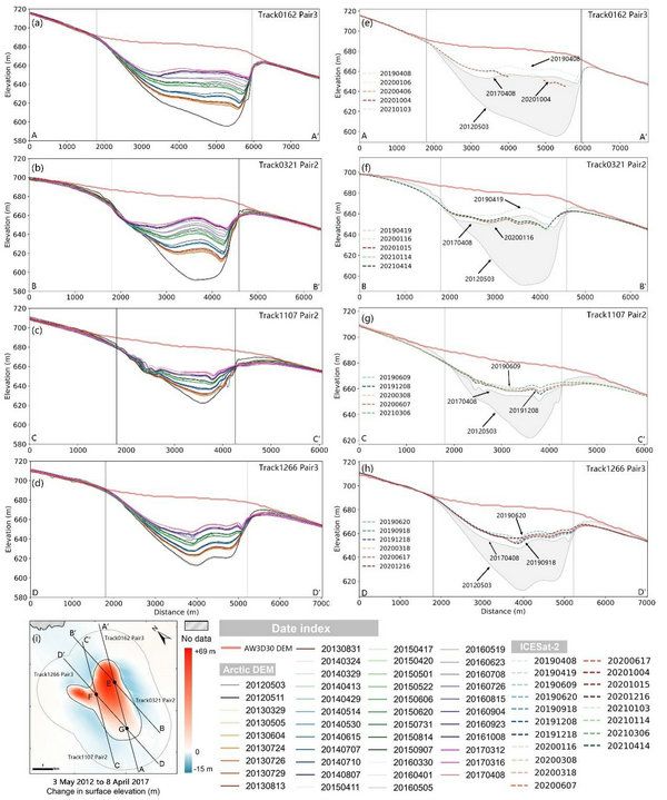 在2019年8月下旬发生了一次短暂的冰下湖排水事件,这次排水事件引起冰下湖下游区域冰流速突然增长到之前的3倍,但随着冰下排水系统的完善以及融水的迅速排出,下游冰流速也迅速恢复至之前的状态。研究表明,冰下湖现存水量的多少、底部基岩的地形起伏以及冰盖表面融化状态等多种因素共同决定着冰下湖的蓄排水周期。此外,本研究还对流入冰盖底部的表面融水进行了量化,结果表明只有约64%的表面融水最终汇入了冰下湖中。
