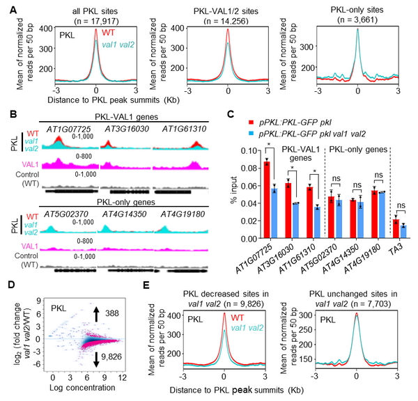图2. VAL1/2直接招募PKL到它们的共同靶基因