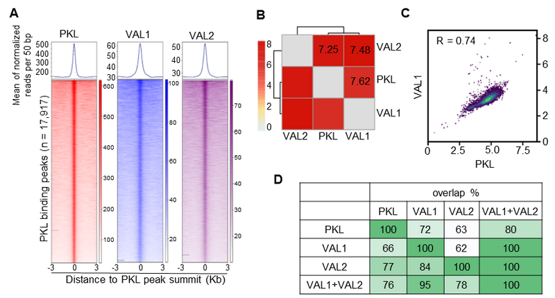 图1. PKL与VAL1/2在拟南芥基因组中广泛共定位