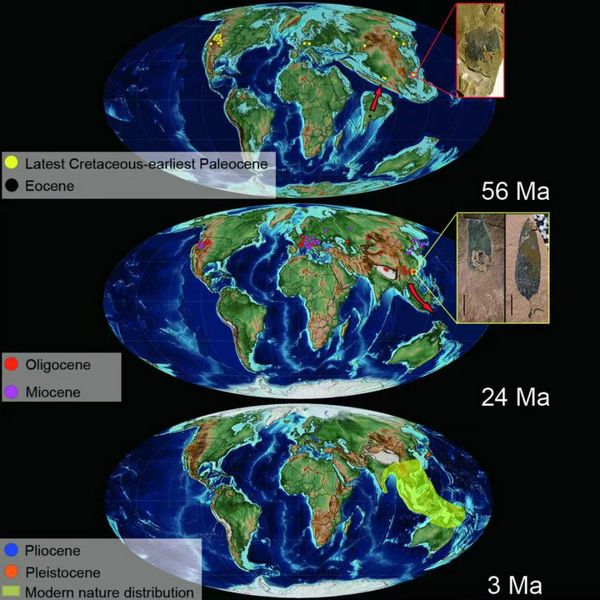 图1 古地理图显示不同时期臭椿属化石和现生分布及其可能的传播路线