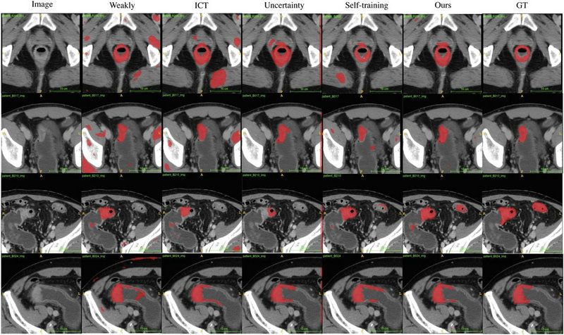团队利用来自bat365在线中国登录入口附属第六医院和喀地一院的923例有标注结肠癌CT影像和2670例无标注结肠癌CT影像作为SOUSA框架的训练数据集,并利用417例结肠癌CT影像对SOUSA框架进行验证,结果显示其自动分割效果优于现有的弱监督和半监督学习模型。与目前最先进的方法ICT (Verma et al.,2019)、不确定性感知(Yu et al.,2019)和自我训练相比,SOUSA框架在每个数据比率上都达到了最佳性能。此外,当数据集的大小有限时,SOUSA框架的性能甚至与使用密集注释的模型的性能相当。