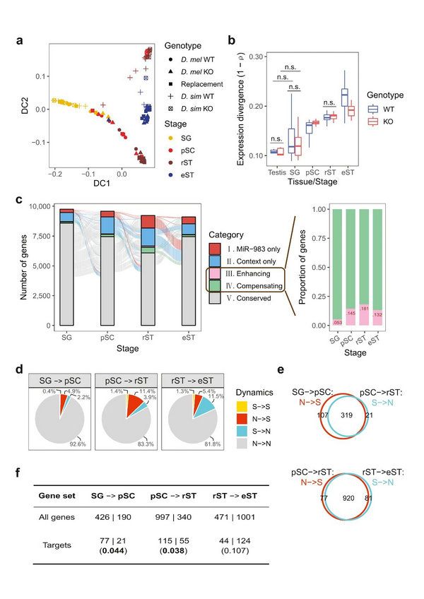 该研究利用基于CRISPR/Cas9技术的基因敲除、基因替换和精巢转录组测序,拆分了单个反式作用因子miR-983及遗传背景差异对黑腹果蝇与拟果蝇之间表达进化的贡献,发现尽管遗传背景效应占主导且与miR-983的效应负相关,但是miR-983的效应确实增加了物种间基因表达的分歧。进一步对精子发生过程中的不同细胞类型进行单包囊转录组测序(single-cyst RNA-seq),发现精子发生相关的特定功能基因在歧化选择或多样化选择下时空特异地获得或丢失miR-983调控(图1),有助于减少拮抗的基因多效性。有意思的是,在基因表达变化最为剧烈的圆形精细胞时期,miR-983效应的强度最弱但获得miR-983调控的基因数目最多,暗示miR-983的调控特异性取决于发育过程中的基因表达动态。