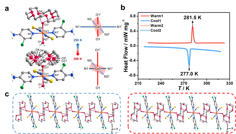 冠醚由于其结构灵活,可充当有序-无序型相变过程中分子马达的“转子”,被广泛用于构筑人工分子机器及结构相变配合物。最近,分子磁体研究团队通过选用18-冠醚-6和具有姜-泰勒效应的Co(II)离子,巧妙合成了一例具有“Rc···Rw−S−Rw···Rc”型超分子结构的磁性配合物(其中Rc和Rw分别指代冠醚和水分子“转子”,S指代Co(II)“定子”)。上述磁性分子固体在室温附近发生可逆一级相变,晶体结构上主要表现出姜-泰勒轴的可逆转换以及18-冠醚-6“转子”的热辅助转动(图1),可推断高温时转动的冠醚通过分子间氢键拉动配位水分子,从而触发了分子结构的动态变化。