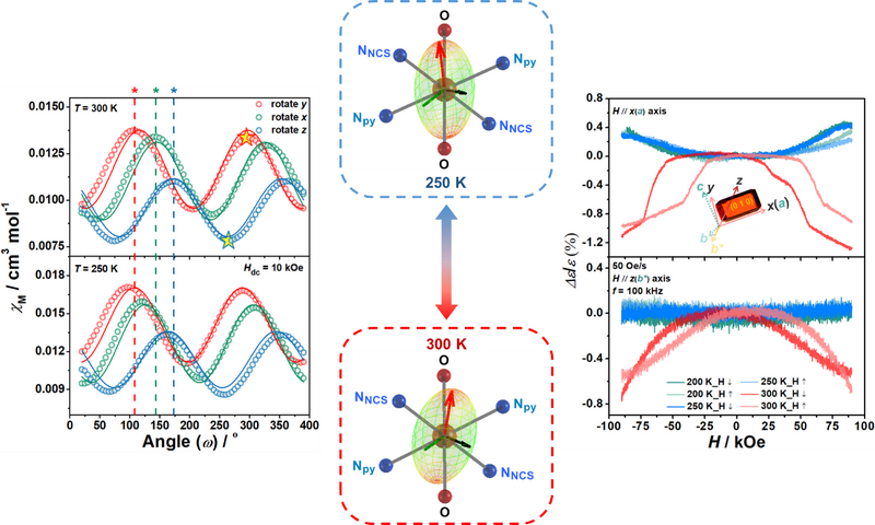 该工作精准设计与合成了一例有序-无序型Co(II)相变配合物,姜-泰勒轴和冠醚“转子”的热辅助动态变化引发了配合物磁电性质的可逆转换,第一次为相变型分子磁性材料的单晶磁各向异性及磁介电效应的协同调控提供了范例。