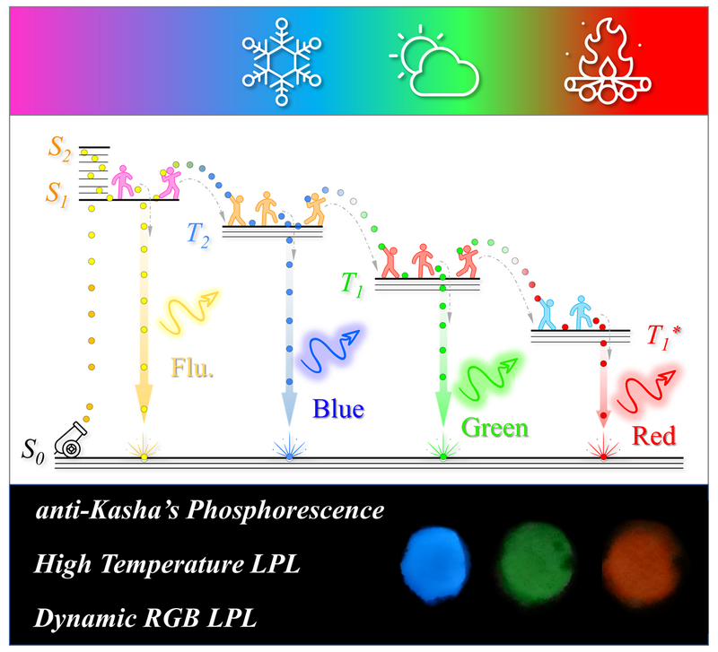 受制于有机分子的能级分布和卡莎规则的限定,大多数有机分子往往不具备丰富的三重态发射特性。如何诱导出更高能级的三重态磷光发射一直是困扰研究人员的一个难题。此外,由于高温会加速有机分子的非辐射衰减过程,导致其三重态发光极易被猝灭。因此,对于有机分子高温磷光的报道目前仍然十分稀少。