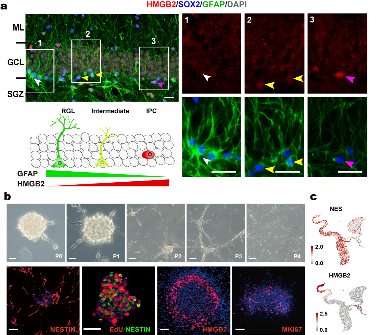 图2 成年灵长类海马体神经发生的关键调控基因及体外验证。a.免疫荧光染色证明HMGB2 基因表达量与RGL 向IPC 的转化过程密切相关; b.分离培养的成年食蟹猴海马细胞具有多次分裂及传代潜能,并表达典型的神经干细胞标志物;c.单细胞测序证明体外培养海马细胞表达典型的神经干细胞标志物基因。