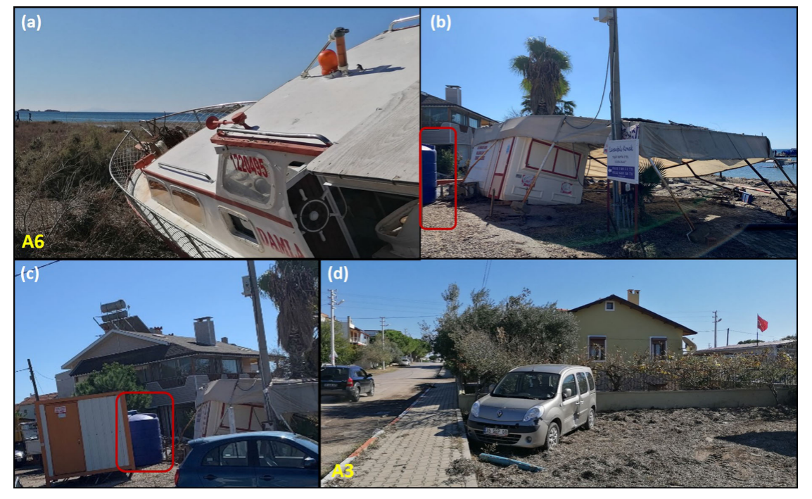 图2. Akarca地区海啸灾害实地调查 (Doğan et al., 2021)(a)海啸将一艘船搬移内陆90米(b)Akarca渔港区沿岸基础设施损毁严重(c)海啸将半满水箱从海岸线搬移至内陆(d)一辆汽车被海啸拖入内陆55米并损毁