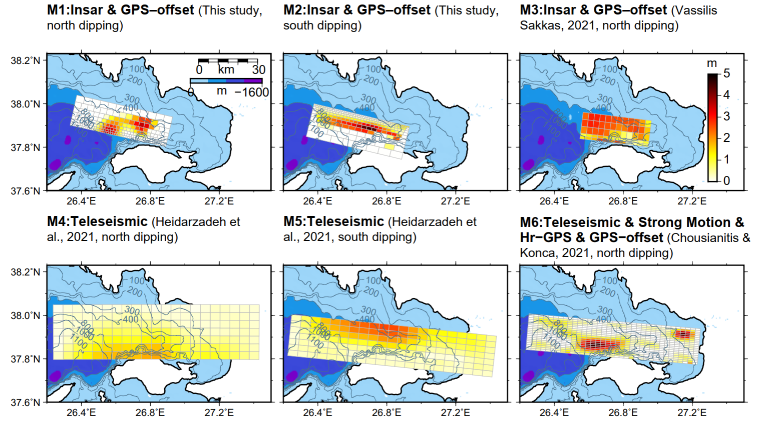 图3. 2020年Samos地震的滑移分布(M1~M6),其中M1和M2由本研究独立反演确定,M3-M6为其他研究者的震源结果,其中灰色曲线表示水位等深线