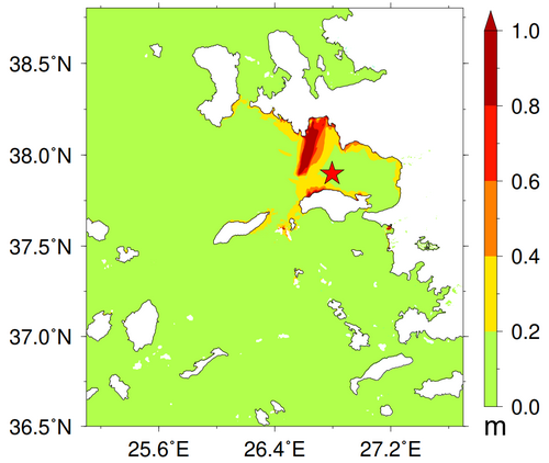 图4.爱琴海东部最大海啸波高的空间分布(M1)