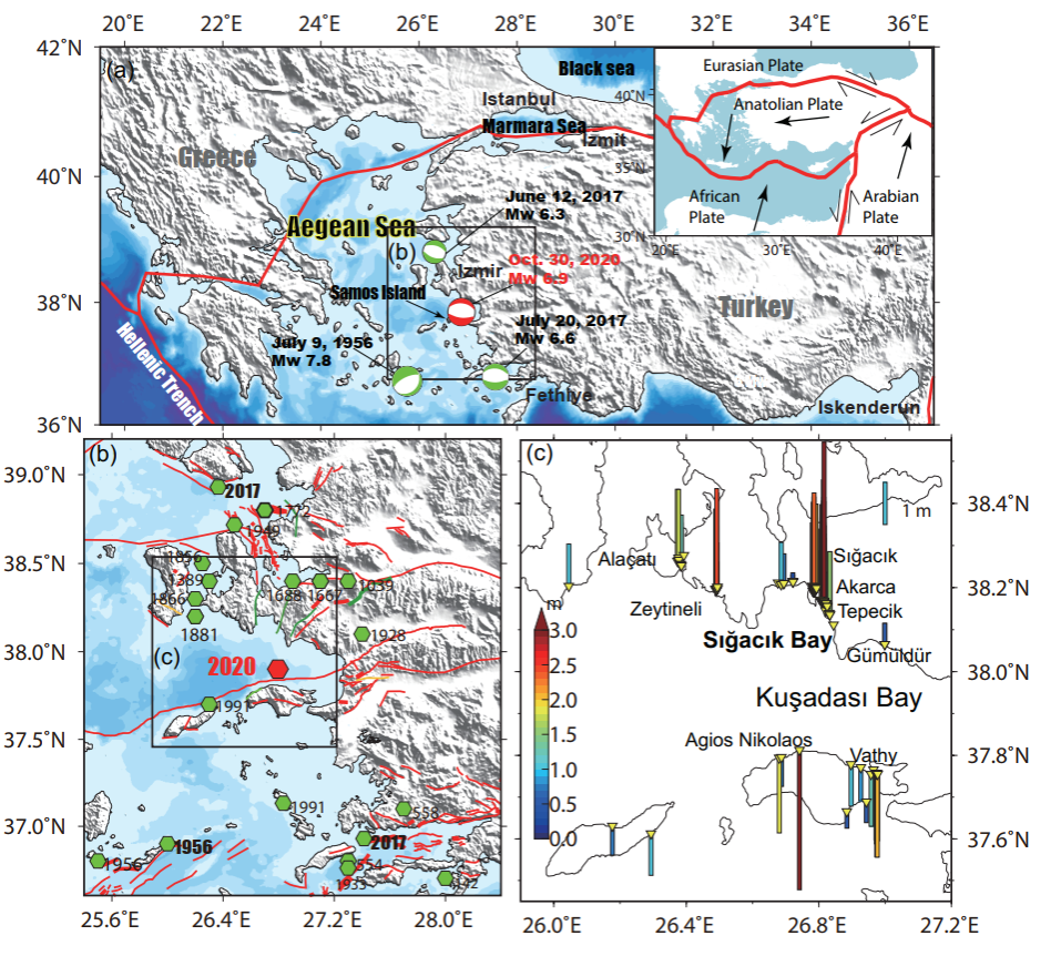图1. 2020年Samos地震的构造背景(a)爱琴海东部历史大地震(b)Samos岛附近的历史海啸(公元142 至公元2020)(c)2020年Samos海啸事件的实地勘测波高