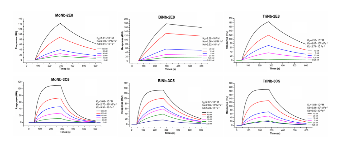 与传统抗体相比,纳米抗体具有结构稳定、亲和力高、不易聚集、可识别潜在抗原表位、易于人源化等优点,常被用作结构生物学、细胞生物学和发育生物学等研究工具。通过三轮生物学淘选,成功筛选出20株特异性纳米抗体。其中,对纳米抗体Nb-2E8和Nb-3C5进行串联改造,发现其在纳摩尔范围内与E2蛋白特异性高亲和力结合。结果表明,与单价抗体相比,多价纳米抗体Nb-2E8和Nb-3C5显示出高亲和力。与单价形式相比,亲和力提高100倍以上,表明可以应用于检测血清中的CHIKV病毒颗粒,并为疾病诊断、药物治疗和疫苗研发等提供帮助。
