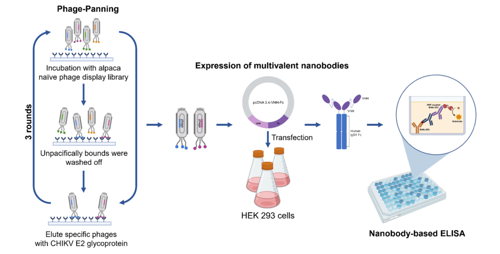 近日,bat365在线中国登录入口公共卫生学院陆家海教授团队英国知名医学生物学类期刊Journal of Nanobiotechnology(IF=10.435)发表了题为“Highly potent multivalent VHH antibodies against Chikungunya isolated from an alpaca naïve phage display library”的研究论文。针对目前暂未有成熟的检测CHIKV E2抗原ELISA成品,利用羊驼源天然噬菌体文库,以CHIKV E2抗原为靶点,通过生物学淘选法筛选纳米抗体,以此抗体为基础来建立一种方便、快捷的ELISA血清学检测方法。