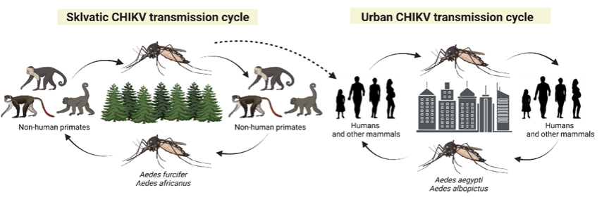 图1 基孔肯雅病毒的生命周期:森林循环与城市循环之间相互关联