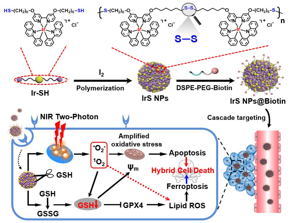 图1. 铱(III)配位聚合光敏剂诱导肿瘤细胞凋亡和铁死亡的作用机理示意图