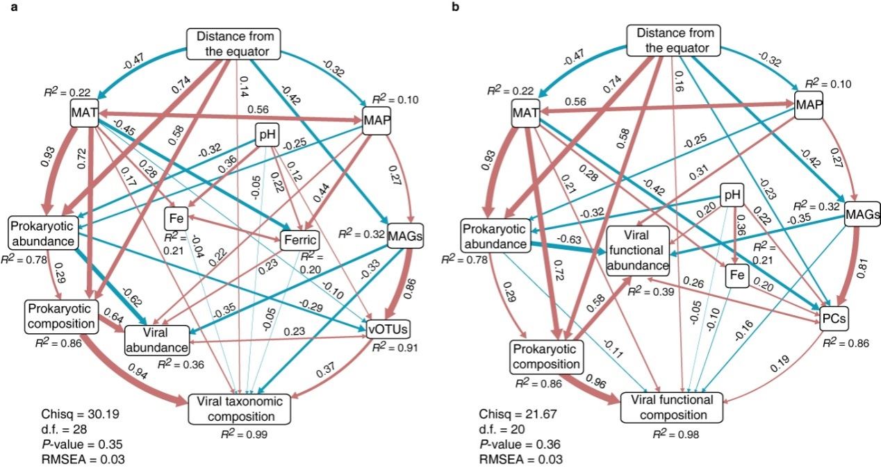 图2. 结构方程模型揭示生物和非生物因子对于AMD底泥病毒群落的影响