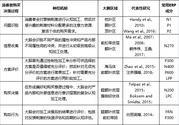 在整理和评述近20年ERP实证研究相关文献的基础上,文章梳理和总结了消费者购买决策的神经机制及常用ERP成分(见表1),为营销学者应用ERP神经技术研究消费者决策提供了ERP成分指南和对应大脑活动区域的参考,有助于营销学界更好地运用ERP技术来指导和发展现有营销管理理论和营销管理实践。