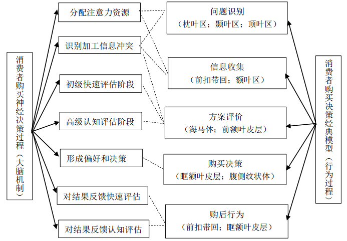 更重要的是,文章从神经营销学视角提炼出7个阶段的消费者购买神经决策过程,分别是:分配注意力资源、识别加工信息冲突、初级快速评估、高级认知评估、形成偏好和决策、对结果反馈快速评估、对结果反馈认知评估。消费者购买神经决策过程建立了神经营销学视角与传统营销学视角的对应分析关系(见图1)。从神经营销学来看,传统营销学中消费者购买决策过程5个阶段和大脑机制的7个阶段并不是完全对应。例如,方案评价过程和购后行为还包含了初级快速评估和高级认知评估两个阶段。在大脑结构层面,营销刺激中的视觉信息、听觉信息和感觉信息会分别激活大脑中的枕叶(Occipital lobe)、颞叶(Temporal lobe)和顶叶区(Parietal lobe)。这些刺激信息分别从不同的大脑区域出发,按照各自相应的路径汇集到额叶区(Frontal lobe),进行高级认知加工处理,从而形成消费者偏好和决策。文章对神经营销学以及消费者购买决策神经过程的详细探讨,有助于营销学者通过神经营销 ERP 技术来论证、完善和深化现有的营销管理理论,对神经营销学的发展也具有积极意义。