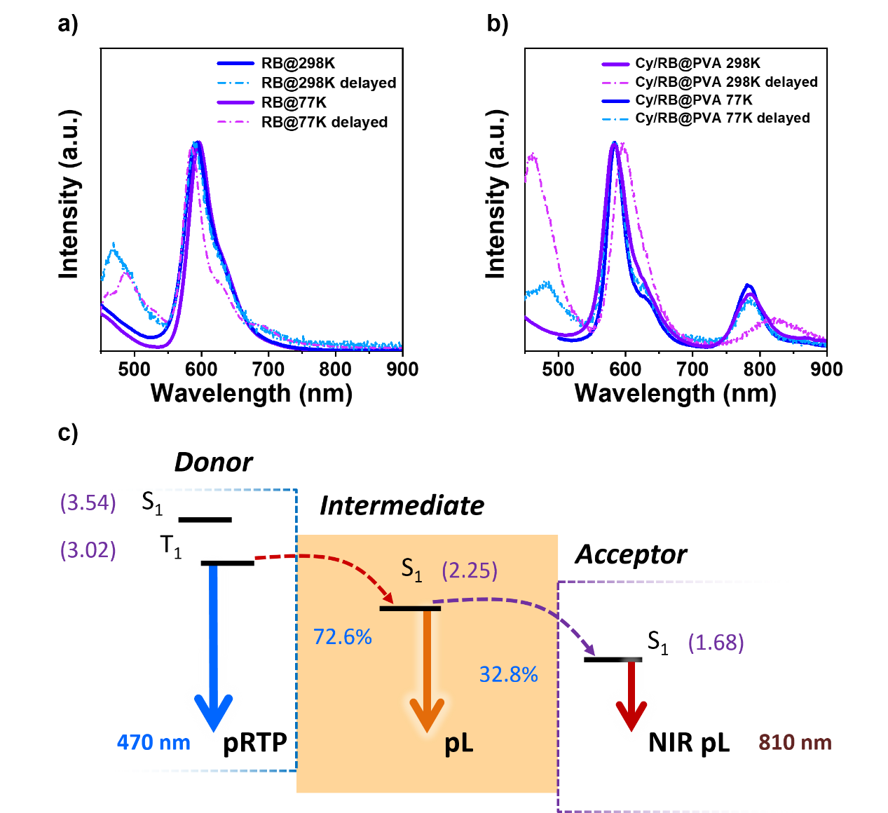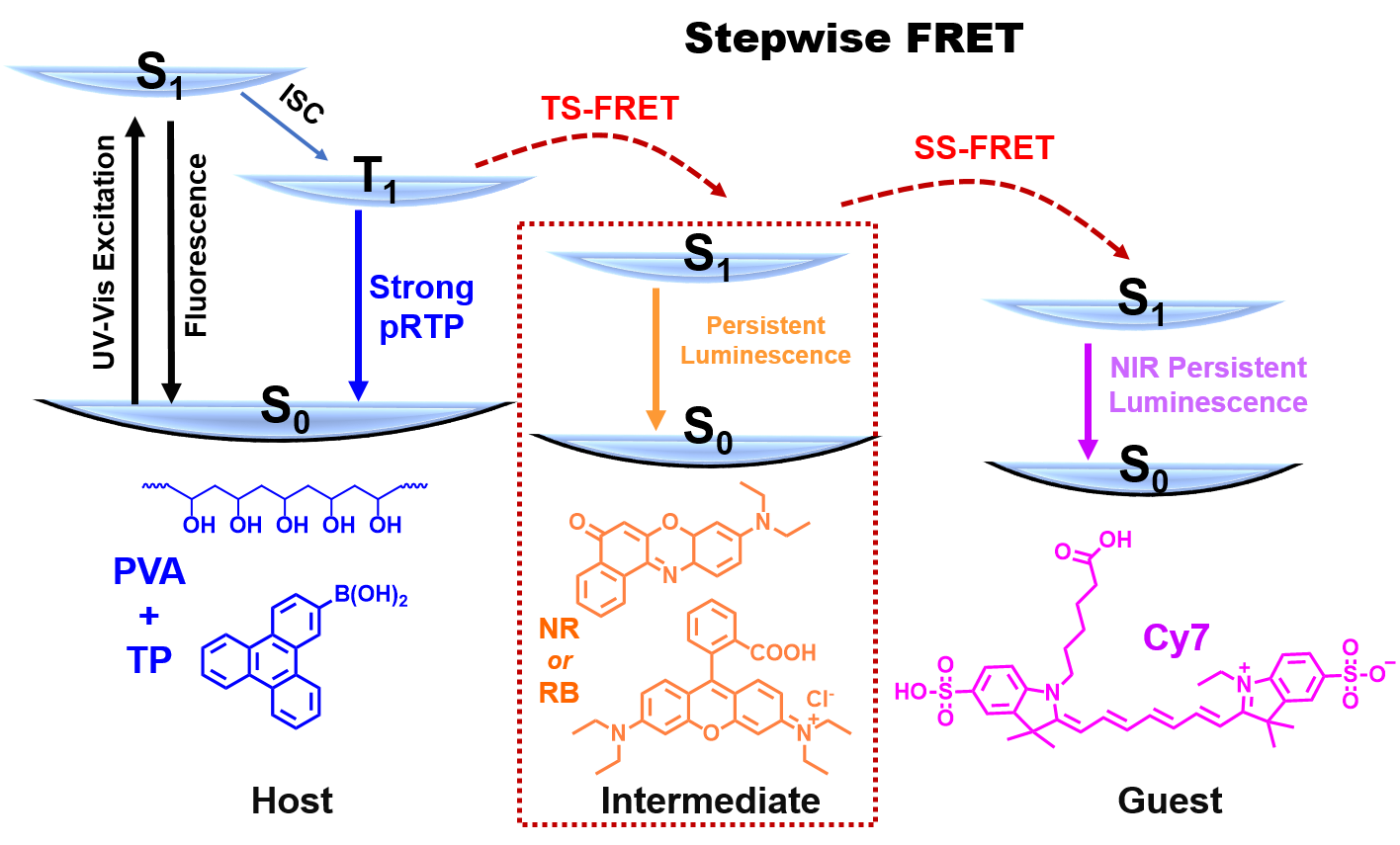 和常见的有机晶体或者聚合物超长磷光体系一样,虽然TP@PVA体系的磷光效率很高而且寿命很长,但是其超长磷光波长较短,在600 nm以下。为了适合长波长领域的应用,人们在尝试增加发光波长的研究。我们团队以及天津大学李振教授等曾利用“三线态-单线态(T-S)能量转移”的策略来增加发光波长。我们在超长磷光晶体表面吸附少量长波长荧光染料,超长磷光在晶体和荧光染料界面发生能量转移,促使荧光染料产生长寿命发光,得到了具有640 nm超长磷光(ACS Appl. Mater. Interfaces, 2020, 12, 5073)。在此基础上,我们利用上述TP@PVA体系,进一步提出了“阶梯型”能量转移策略,在PVA聚合物中共掺杂磷光分子TP、红光染料(罗丹明RB/尼罗红NR)和近红外染料Cy7,构筑两个连续的呈现“阶梯型”的能量转移过程:超长磷光分子TP的三线态激子向红光染料分子进行“T-S能量转移”,紧接着红光染料分子向近红外染料分子Cy7的“单线态-单线态(S-S)能量转移”,成功获得了发光寿命长达0.20 s的近红外(810 nm)超长磷光聚合物复合体系(图1)。