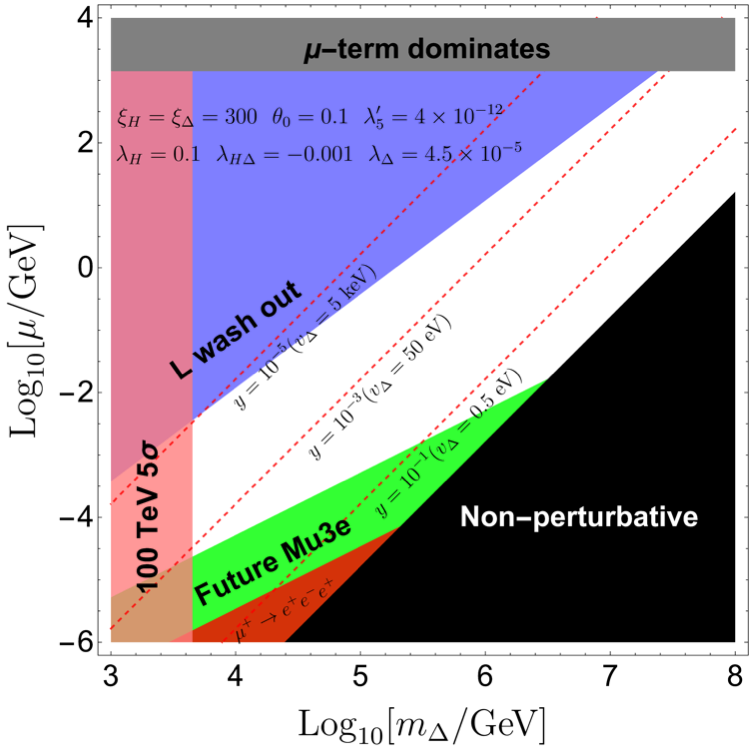 图1:能够同时解释暴胀、中微子质量和重子不对称性的参数空间。横坐标为希格斯三重态的质量,纵坐标是标准模型希格斯与希格斯三重态耦合的大小,其中黑色、蓝色、灰色及红色区域是被排除的区间。