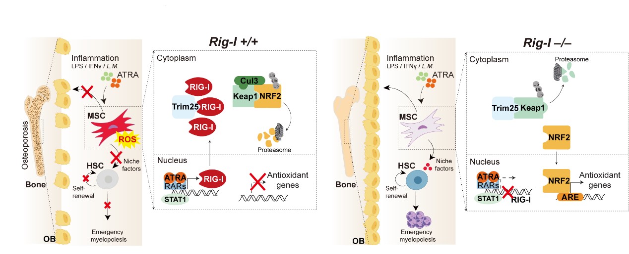 RIG-I维甲酸诱导基因-I(retinoic acid-inducible gene I)最初是在维甲酸(ATRA)诱导白血病分化治疗研究中发现的维甲酸上调基因。此次研究发现,维甲酸、干扰素、细菌感染等刺激可以在间充质干细胞中显著上调RIG-I基因的表达,导致间充质干细胞的成骨分化能力受损,从而诱发骨质疏松症,并且还会损伤间充质干细胞的造血支持功能,进而导致造血干细胞移植后的植入不良和移植后的细菌感染等并发症。