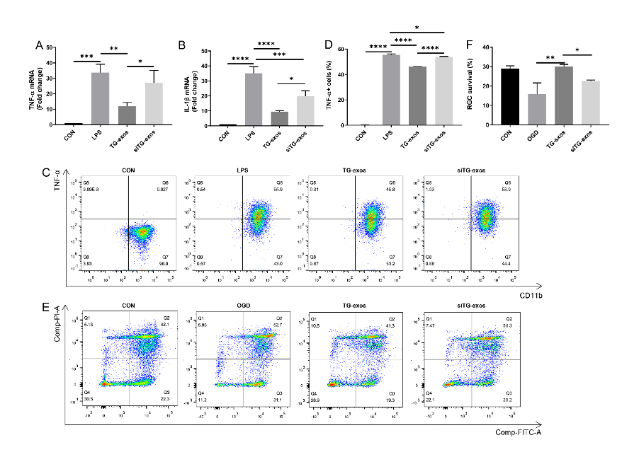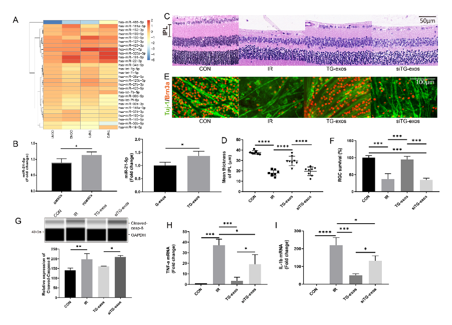 图3. TG-exo内的miR-21-5p介导了炎症抑制和对RGC的保护作用
