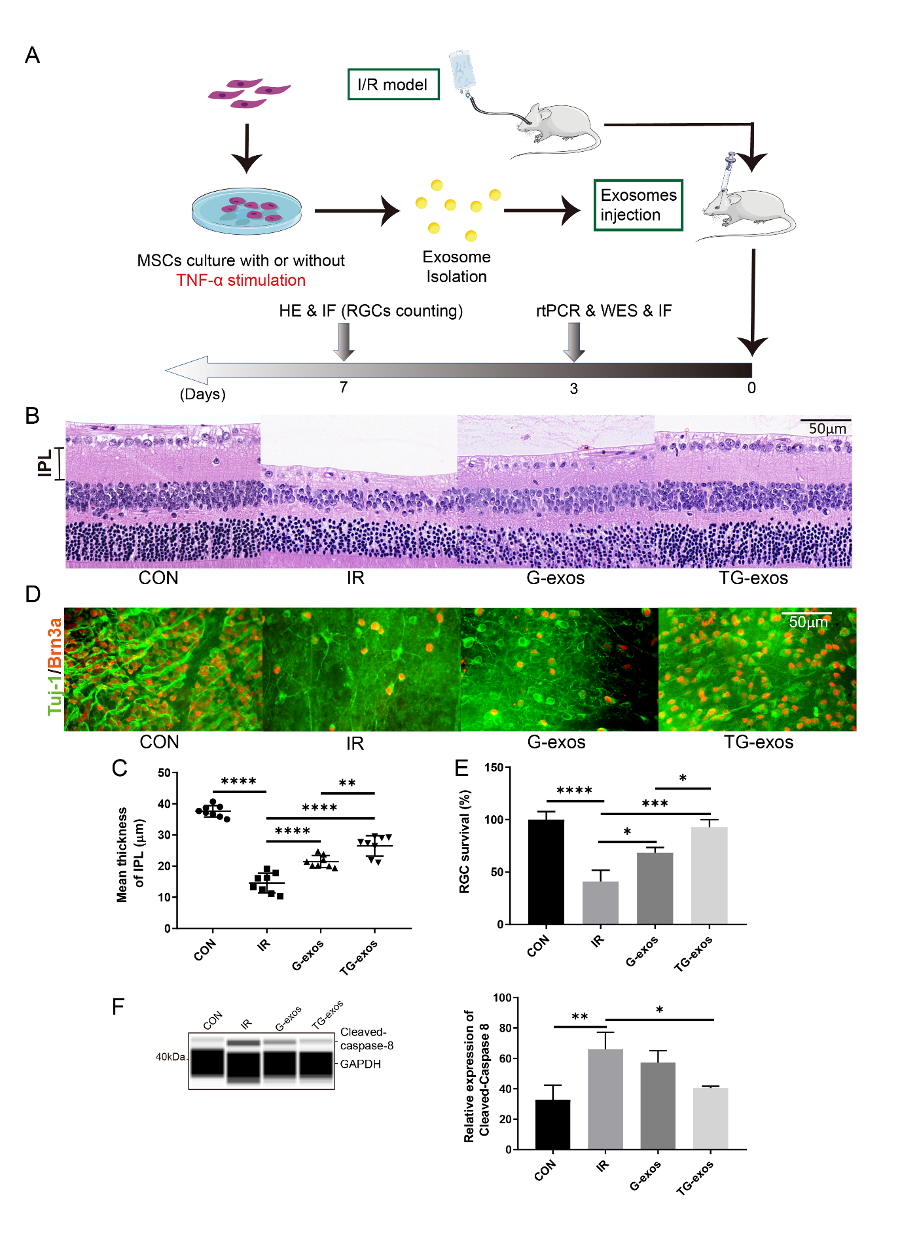 MSC可通过旁分泌机制发挥免疫调控作用,其中MSC来源的外泌体作为一种MSC分泌的亚细胞成分,可以作为MSC的旁分泌因子来发挥生物学效应,为进一步实现无细胞治疗( cell-free therapy )提供了新的实现途径。外泌体是由细胞内多泡体与细胞膜融合后,释放到细胞外基质中的膜性囊泡,直径为30-150nm。其内含有蛋白、mRNA和miRNA等物质,广泛参与细胞之间的交流。该研究工作将MSC来源的外泌体(G-exo)经玻璃体腔注射,应用于视网膜损伤的治疗,发现可以调节免疫炎症反应,保护视网膜神经节细胞(Retinal ganglion cell,RGC)损伤。并且首次发现TNF-α 预刺激后,可增强MSC来源的G-exo(TG-exo)的保护作用。