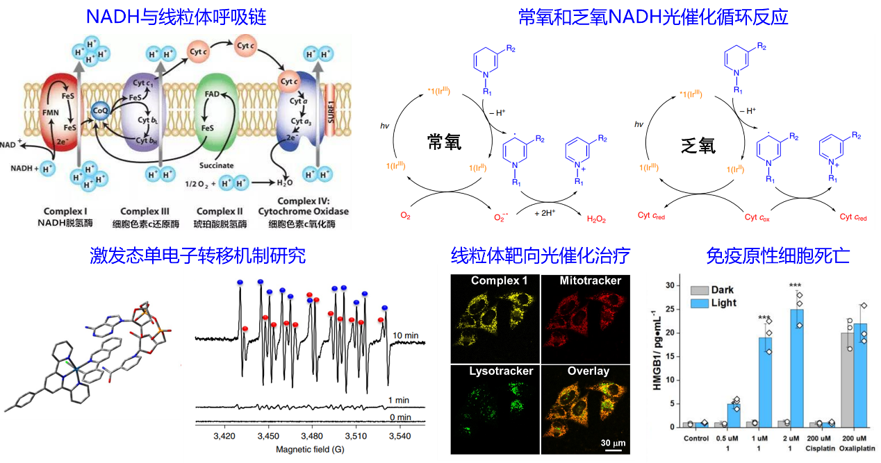 首先,团队首次提出乏氧肿瘤光催化治疗理论。线粒体呼吸链是能够感受氧气浓度变化的敏感细胞器,并通过线粒体呼吸链调控乏氧诱导因子的表达以促进肿瘤适应乏氧环境。通过设计线粒体靶向金属光敏剂,利用铱光敏剂的微秒级长激发态寿命和激发态高氧化还原电位,基于低耗氧的光致电子转移机制,在常氧和乏氧环境下均实现对线粒体呼吸链电子供体,还原态烟酰胺腺嘌呤二核苷酸(NADH)的高效光催化氧化,进而破坏线粒体电子传递链正常生理功能,肿瘤乏氧诱导因子的无法顺利表达,肿瘤细胞内氧化还原失衡并诱导肿瘤免疫原性细胞死亡(图1)。这项研究为开发治疗乏氧肿瘤的新型光敏剂,提供了新概念和新方法,该成果以“Targeted photoredox catalysis in cancer cells”为题发表于化学顶级期刊Nature Chemistry(2019,11,1041,IF = 24.4,SCI高被引论文),bat365在线中国登录入口药学院(深圳)黄怀义副教授和印度理工学院Samya Banerjee助理教授为论文的共同第一作者,英国华威大学Peter Sadler教授、法国巴黎文理研究大学Gilles Gasser教授和bat365在线中国登录入口化学学院巢晖教授为论文的共同通讯作者,bat365在线中国登录入口为该成果第一完成单位。