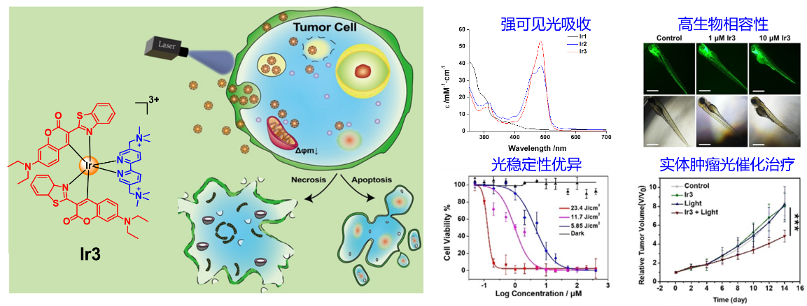 图2. 强光吸收、高生物相容性铱光敏剂用于肿瘤光催化治疗