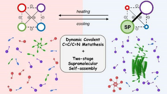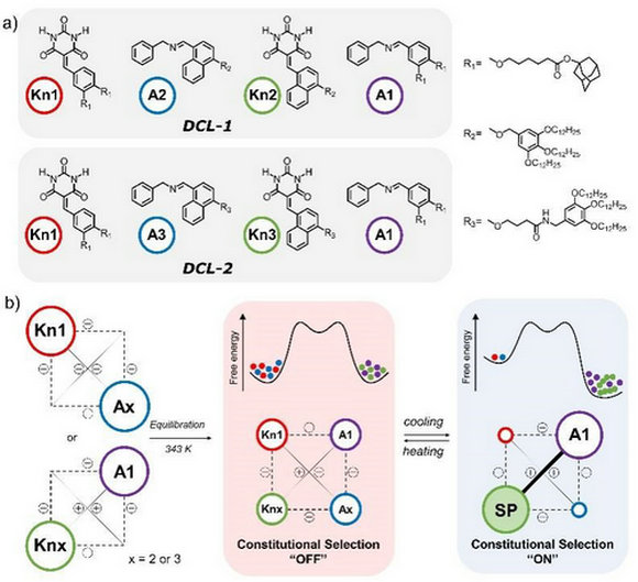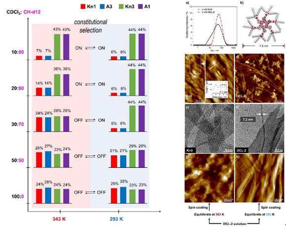 近日,我校化学学院Lehn功能材料研究所与Jean-Marie Lehn教授合作,在前期对新型C=C/C=N动态共价交换反应的研究基础上(J. Am. Chem. Soc. 2018, 140, 5560; Chem. Asian J. 2021, 16, 44),以温变后的二阶超分子自组装作为驱动力,设计构建了具有三重动态的四组分动态组合库(图1)。以DCL-2为例,化合物Kn1和Kn3都能通过第一阶的双重氢键的自组装形成六元超分子环,而化合物Kn1结构的金刚烷基团因位阻效应阻止其进行第二阶的π-π堆积,与此同时Kn3能够顺利进行第二阶自组装形成丝状超分子聚合物。以Kn1和Kn3的能量差为驱动力,各组分通过C=C/C=N交换反应进行含量的重新排布,最终形成以化合物Kn3主导的偏离态分布,从而获得组分对环境温度的选择适应性。