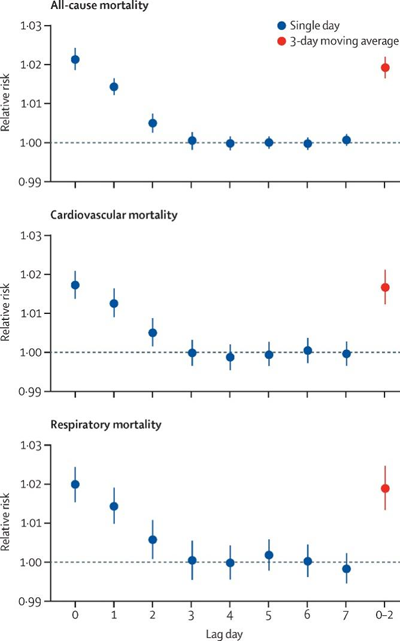 该研究发现,野火来源PM2.5暴露的3天移动平均值(滞后0-2天)每增加10µg/m³,全死因死亡的汇总相对危险度(RR)为1.019(95%置信区间: 1.016-1.022),心血管死亡为1.017(1.012-1.021),呼吸系统死亡为1.019(1.013-1.025)(图2)。人群归因百分比结果显示,每年有0.62%(95% 置信区间: 0.48-0.75)的全因死亡、0.55%(0.43-0.67)的心血管死亡和0.64%(0.50-0.78)的呼吸系统死亡可归因于野火来源PM2.5的急性暴露。