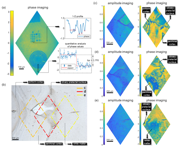 单像素复振幅成像,待测样品为未染色鼠脑组织切片(a)相位分辨率靶成像,用于理论精度验证;(b)显微镜下的染色鼠尾组织成像;(c)-(e)单像素全息系统在对应位置的复振幅成像。