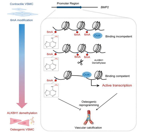 该研究以慢性肾脏病为研究模型,检测了伴有或不伴有主动脉弓钙化的患者的白细胞中6mA水平,发现白细胞中6mA水平随血管钙化严重程度的增加而显著降低;在血管钙化患者中,ALKBH1 mRNA和蛋白水平明显升高,而N6AMT1等表观遗传修饰酶表达无明显差异,表明主要是ALKBH1参与了钙化过程的6mA修饰调控,这些结果在慢性肾脏病小鼠模型中得以重复。同时,研究者利用敲低或过表达ALKBH1的腺相关病毒感染慢性肾脏病小鼠的动脉,发现敲低ALKBH1会抑制血管钙化,过表达ALKBH1会促进血管钙化。进一步发现小鼠原代VSMC在过表达ALKBH1时骨形态发生蛋白2(BMP2)降低,揭示了ALKBH1介导的成骨重编程和钙化依赖于 BMP2。机制上,ALKBH1去甲基化DNA 6mA修饰可以促进八聚体结合转录因子4(Oct4)与BMP2启动子结合并激活BMP2转录,BMP2通过增加骨形成的决定性转录因子RUNX2表达来促进VSMC成骨重编程和血管钙化,该分子机制进一步通过平滑肌特异性敲除Oct4所验证。