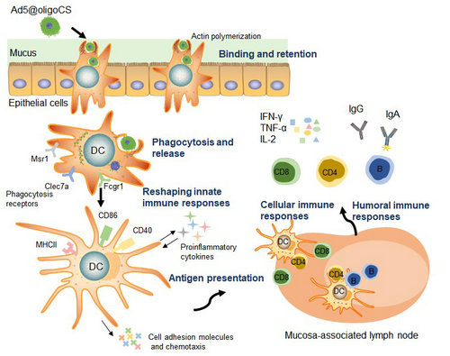 针对该难题,我校公共卫生学院(深圳)孙彩军教授联合浙江大学及中科院等团队通力合作,利用低聚壳聚糖(oligoCS)的自组装性能和生物黏附理化特性,在单个病毒颗粒表面进行化学修饰以改变其黏膜附着能力。研究发现,在合适反应条件下,oligoCS分子可在纳米尺度的单个病毒颗粒表面组装形成一层功能性外壳(Ad@oligoCS),从而改变了病毒颗粒表面的电荷性,增强了病毒载体与黏膜组织表面的相互作用。研究还表明,oligoCS外壳在不影响病毒载体感染活性的基础上,拓展了其对不同细胞种类的基因递送效率。进一步的RNA-seq分析和一系列功能实验发现并证实了该病毒载体疫苗复合物进入细胞的方式从传统的受体介导(receptor-dependent)转变为内吞介导(phagocytosis-dependent),并高效激活了抗原递呈细胞。因此,该策略有望成为一种有潜力的新型黏膜疫苗递送系统。