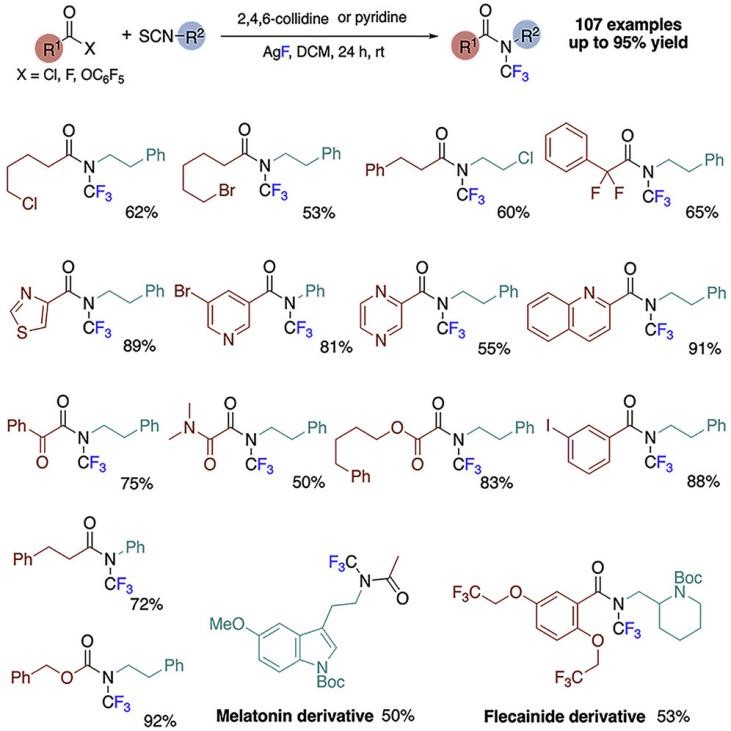 酰胺广泛存在于药物分子中,如抗丙肝药雷迪帕韦(Harvoni)和降脂药阿托伐他汀(Lipitor),三氟甲基(-CF3)广泛应用于药物分子的修饰。作为合成酰胺的理想起始原料,便宜易得的有机羧酸可直接合成N-CF3酰胺。然而,在2019年之前,N-CF3酰胺的构建方法却鲜有报道。该研究揭示了室温下由羧酸衍生物直接合成N-CF3酰胺的新方法。在氟化银的存在下,该策略可在一锅内同时实现异硫氰酸酯的氟化和酰化,得到N-CF3酰胺,并且顺利地应用于药物分子褪黑素(Melatonin)和氟卡尼(Flecainide)相关衍生物的合成。该方法不仅适用于芳基、杂芳基、伯烷基、仲烷基酰卤化物和氯甲酸盐,而且还能兼容溴化烷基、酯、酰胺、醚、腈和羰基等官能团。