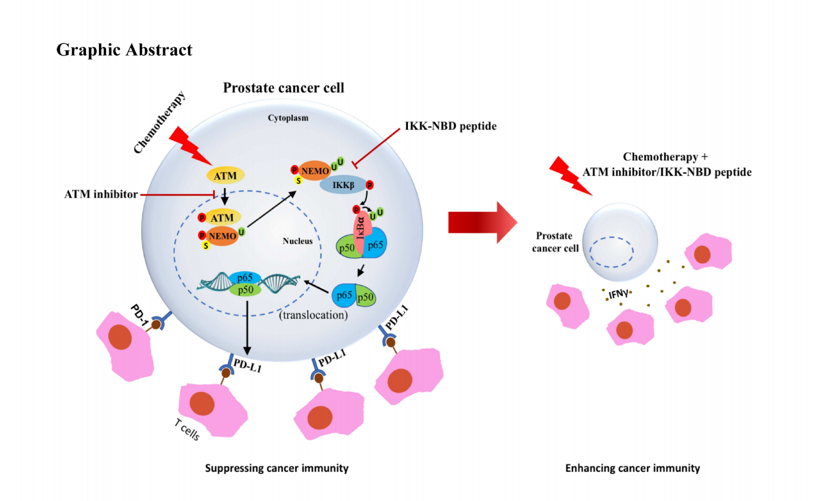 邵兰教授介绍,该研究成果不仅揭示了多西他赛化疗引起的肿瘤免疫逃逸相关分子和免疫机制。同时,在包括人源化等多种动物模型实验结果显示,NEMO或ATM抑制剂联合多西他赛化疗可使前列腺肿瘤抑制率从40.3%提高至62.8%-74.9%,并且效果优于PD-L1抗体与多西他赛联合用药组,提示NEMO和ATM可能是两个新的肿瘤免疫治疗靶点。
