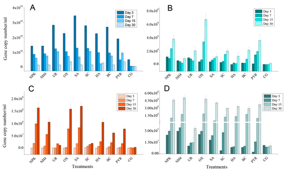 近期,我校生命科学学院李文均教授团队利用16S rRNA扩增子测序和qPCR技术,在珠江沉积物微观环境中,探讨了不同生物刺激剂对芘降解、原核生物群落组成和功能的影响(图1-3)。结果表明,对照组、PYR(仅含芘)和生物刺激剂添加组的原核生物群落组成差异显著(p<0 .05)。生物刺激剂中,生物炭、草酸、水杨酸、npk和硫酸铵均可增强微生物群落对芘的降解潜力。黄杆菌属(Flavobacterium)、氢噬菌属(Hydrogenophaga)、分枝杆菌属(Mycobacterium)、红球菌属(Rhodococcus)、黄腐杆菌属(Flavihumibacter)、假单胞菌属(Pseudomonas)、新鞘脂菌属(Novosphingobium)等在所有实验组中占主导地位,表明这些属在芘代谢中起着重要作用。基于较高的GP-RHDnidA基因丰度,我们推测革兰氏阳性的原核生物群落比革兰氏阴性的原核生物群落更能分解芘。此外,NPK和SA处理中nifHpqqC基因显著更丰富的证据表明,不同的生物刺激剂可能富集某些细菌组合。此外,NPK、OX(草酸)、UR(尿素)、NH4、和SC(水杨酸盐)组也表明,不同的生物刺激剂可能对原核生物群落演替产生不同的生态影响。本研究为生物刺激法降解芘的研究提供了新的思路。因此,在设计生物刺激技术时,研究群落结构和功能及其对退化的影响同样重要。