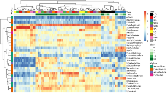 图1. 热图显示了30个高丰度属在不同处理和时间点的分布和丰度