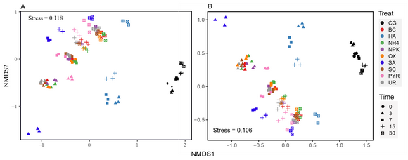 图2. NMDS分析基于(A) Bray Curtis (B) Jaccard不同相似性矩阵表示不同时间点处理的原核群落组成