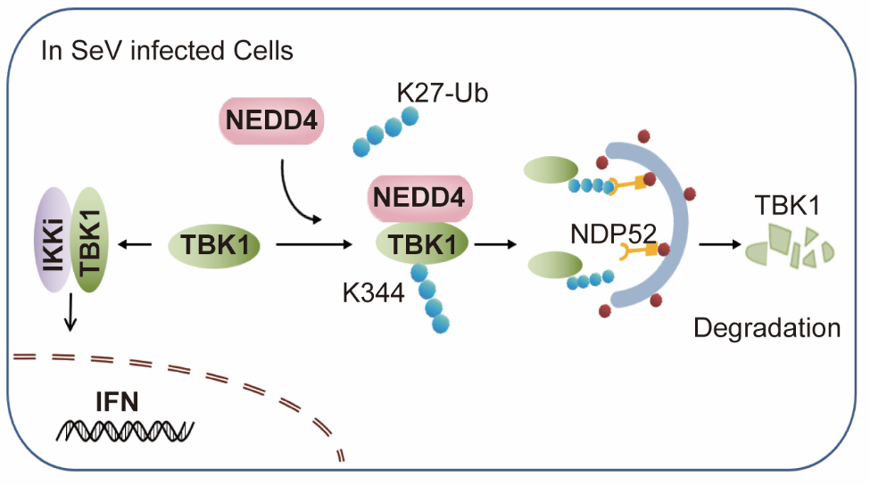 崔隽教授团队发现,NEDD4能够显著抑制抗病毒免疫反应及促进病毒复制。NEDD4在病毒感染中结合TBK1,并显著促进TBK1的降解,但是在无病毒侵染时,NEDD4不影响TBK1的稳定性。进一步研究发现这是由于NEDD4主要靶向磷酸化的TBK1(p-TBK1),并促使p-TBK1发生自噬降解。当TBK1的磷酸化位点(S172)突变后,NEDD4不再能够与之结合并促进其发生自噬降解。NEDD4促使激活的TBK1在K344位点发生K27类型的泛素化修饰。选择性自噬识别受体NDP52通过K27类型的泛素链识别TBK1并将其输送至自噬溶酶体中进行降解。以往的研究表明在病毒侵染的早期,TBK1会发生K48类型的泛素修饰,进而通过泛素-蛋白酶体途径降解。该研究进一步揭示在病毒侵染的后期,激活的TBK1主要发生K27类型的泛素修饰,使得TBK1通过选择性自噬降解途径进一步降解,防止TBK1被过度激活。因此,NEDD4介导的TBK1的自噬降解对于维持抗病毒免疫平衡具有重要的作用。