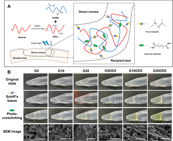 2021年7月6日,我校中山眼科中心为唯一单位,袁进教授作为唯一通讯作者,赵轩博士后和李赛群副主任医师为共同第一作者在Bioactive Materials(Available online 6 July 2021,工程技术Top期刊,中科院一区,影响因子14.593)发表题为“Natural Polymer-Derived Photocurable Bioadhesive Hydrogels for Sutureless Keratoplasty”的研究论文。该工作研发了一种由甲基丙烯酰化明胶(GelMA)和氧化葡聚糖(ODex)组成的光固化生物粘合性水凝胶。该新型生物粘合剂具备良好的光学透明性、组织粘附性和细胞生物相容性,实现了无损伤、无缝线原位固定板层角膜植片,为眼科和外科手术的组织固定提供了新的思路。这也是该团队继“纳米复合型生物载药角膜接触镜(ACS Nano 2016)”、“化学结枝修饰生物活性羊膜(Frontiers in Bioengineering and Biotechnology 2020)”之后又一重要成果。