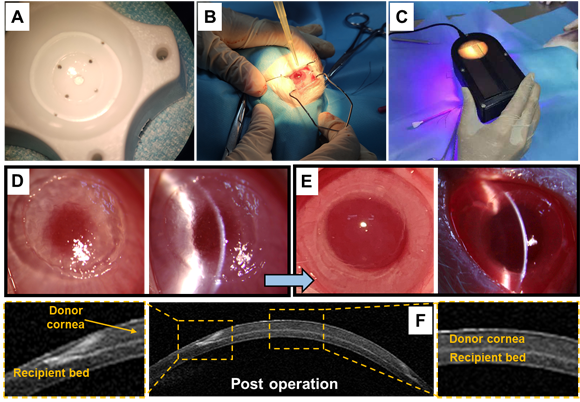 该团队研发的光固化生物粘合性水凝胶,具有高透光率、耐酶解和优异的生物相容性,以及更高的粘附强度,新型凝胶的光固化特性为手术医生进行手术设计规划提供了便捷可操作性,实现角膜植片的原位无缝线固定。