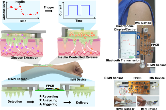 糖尿病是一种危害人体健康的常见型代谢性疾病。如果不对其进行有效监测与及时治疗,将导致各种组织,器官的损害、功能障碍,严重威胁患者的健康。常规的血糖检测要求糖尿病人每天通过指尖采血多次,并根据所测到的血糖值注射适量胰岛素调节体内血糖。这种方式给病人带来许多不便与痛苦,而且只能采集到零散的血糖值。长针头植入式血糖电极以及胰岛素注射容易对皮肤组织造成创伤,引起炎症、排异反应、感染等潜等隐患。因此,开发出能同时监测血糖并智能治疗糖尿病的闭环系统具有临床迫切性。