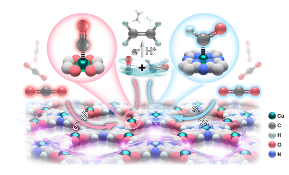 双位点电催化还原二氧化碳制乙烯机理示意图