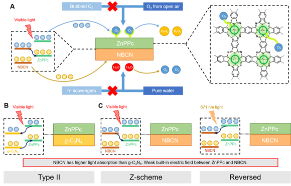 图(A)以水和氧气为原料光催化合成过氧化氢的路径;(B)普通石墨相氮化碳和聚酞菁锌复合催化剂在可见光激发下的分子间电子转移路径;(C)修饰后的石墨相氮化碳与聚酞菁锌复合催化剂在可见光或单色光激发下的分子间电子转移方式