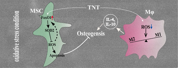 王焱、程斌教授团队采用过氧化氢、脂多糖和高糖分别模拟体内固有的、炎症和糖尿病引发的氧化应激状态,发现在以上各种氧化应激模型中,相比目前临床常用的喷砂酸蚀形成的微米形貌钛种植体表面,纳米管(TNT)形貌可使粘附于其表面的骨间充质干细胞(MSC)具备更佳的抗氧化和成骨分化性能。进一步研究发现FoxO1因子介导了该抗氧化性能:TNT表面一方面通过更佳的亲水性促进MSC粘附,并进一步促使MSC胞内FoxO1表达,从而降低胞内活性氧水平、细胞凋亡比例,并促进成骨蛋白的表达;另一方面,TNT形貌可促使巨噬细胞(Mφ)在氧化应激状态下更多地向抑炎型极化,分泌更多的抑炎因子,影响局部免疫微环境,从而促进免疫成骨(图1)。