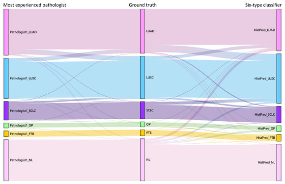 (下)桑基图说明了最佳病理学家判断结果、真实诊断标签与六分类模型预测结果之间的区别。