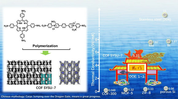 图1 二维聚合物COF SYSU-7(Sun Yat-sen University)的(左侧)高分辨电镜图和(右侧)热导性能图。
