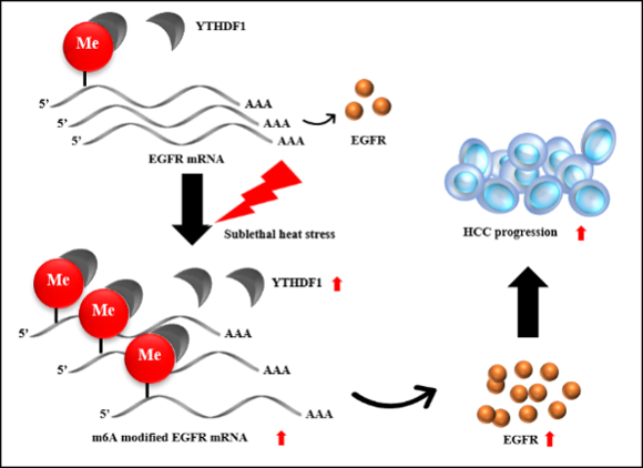 体外功能实验发现在亚致死性热刺激条件下,YTHDF1可促进HCC细胞的生长、侵袭及转移,而在小鼠尾静脉肺转移模型及肝包膜下注射的原位HCC模型中则发现敲除YTHDF1可显著减少由亚致死性热刺激引起的HCC肺转移。进一步机制研究发现,亚致死性热刺激上调表皮生长因子受体EGFR mRNA 5’UTR的m6A修饰水平,进而促进YTHDF1与癌基因EGFR的mRNA结合并上调其蛋白表达水平,导致RFA后HCC的复发转移。EGFR蛋白水平的增加在PDX小鼠HCC消融模型和消融患者的HCC组织中均得到验证。